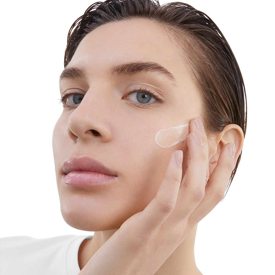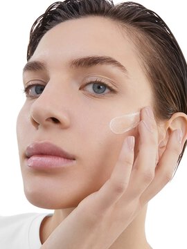 3. PROTECT: Sebarkan tekstur dengan satu tangan dari satu kuil ke kuil lainnya. Dengan kedua tangan Anda, sebarkan formula di pipi dan hidung Anda, dari tengah ke bagian luar wajah dan punggung Anda. akhiri dengan dagu dan leher.